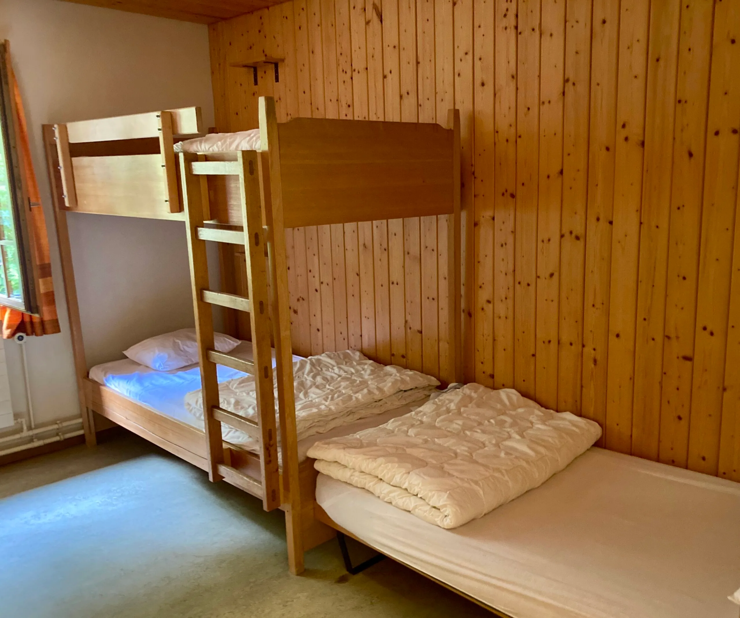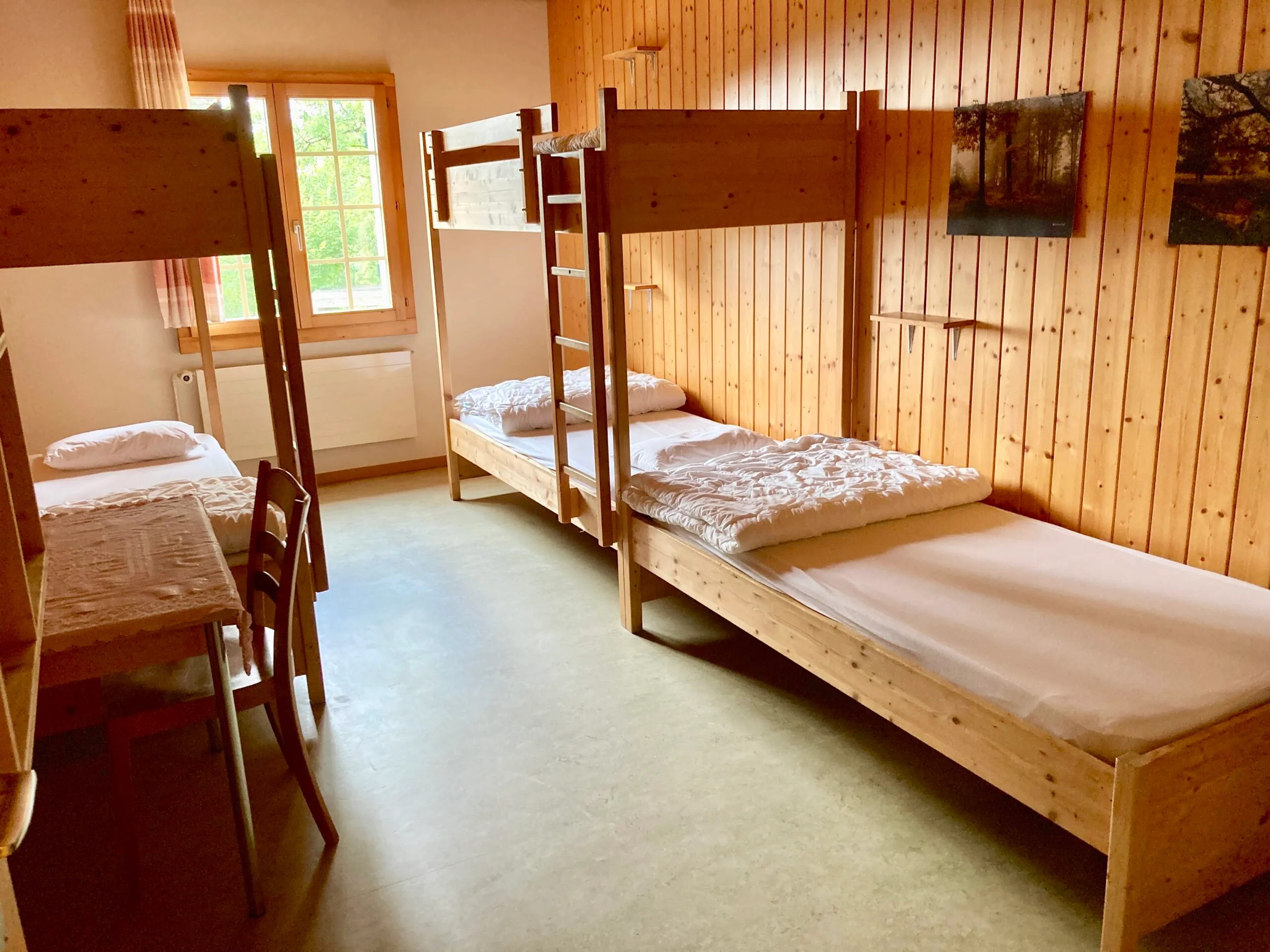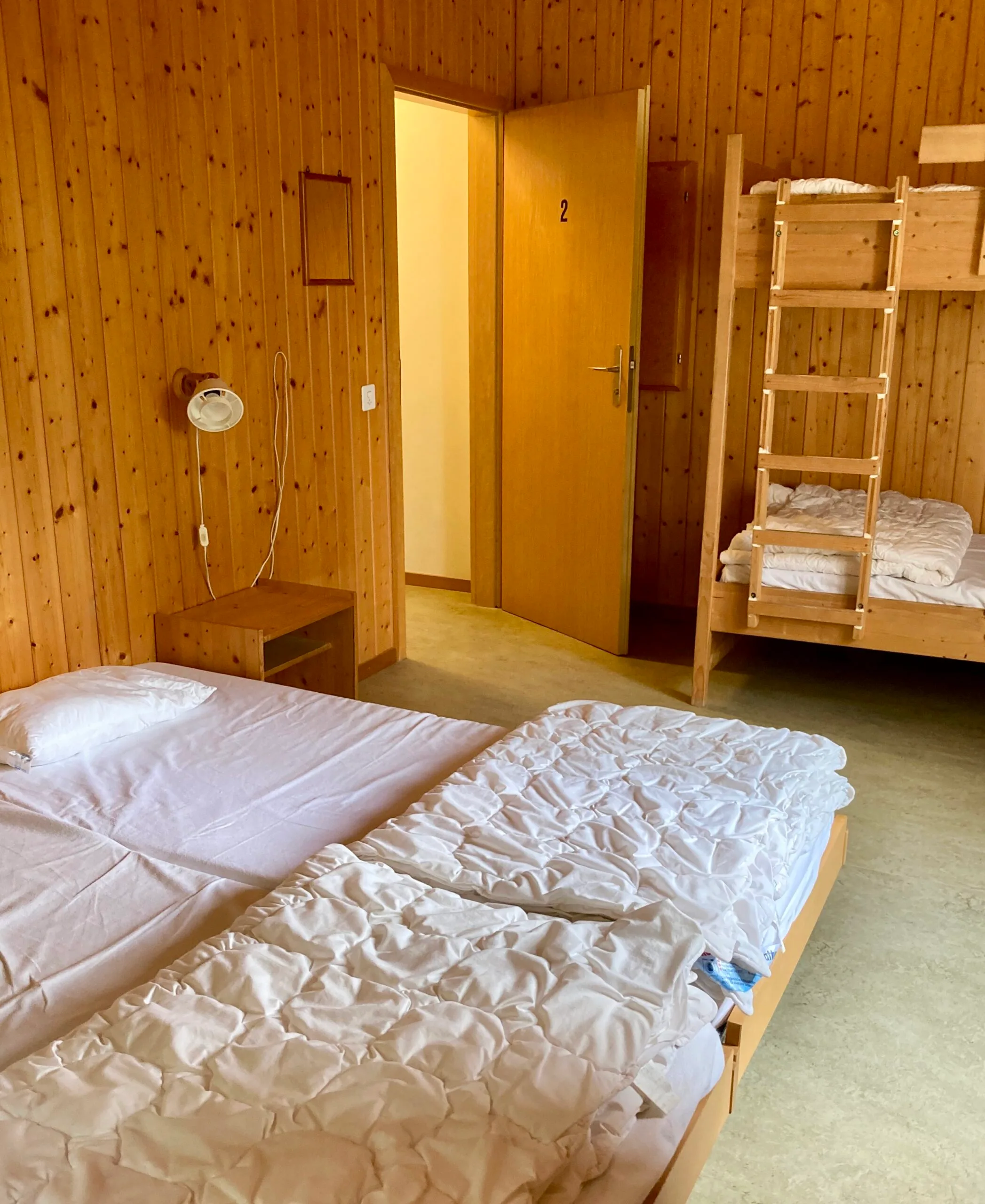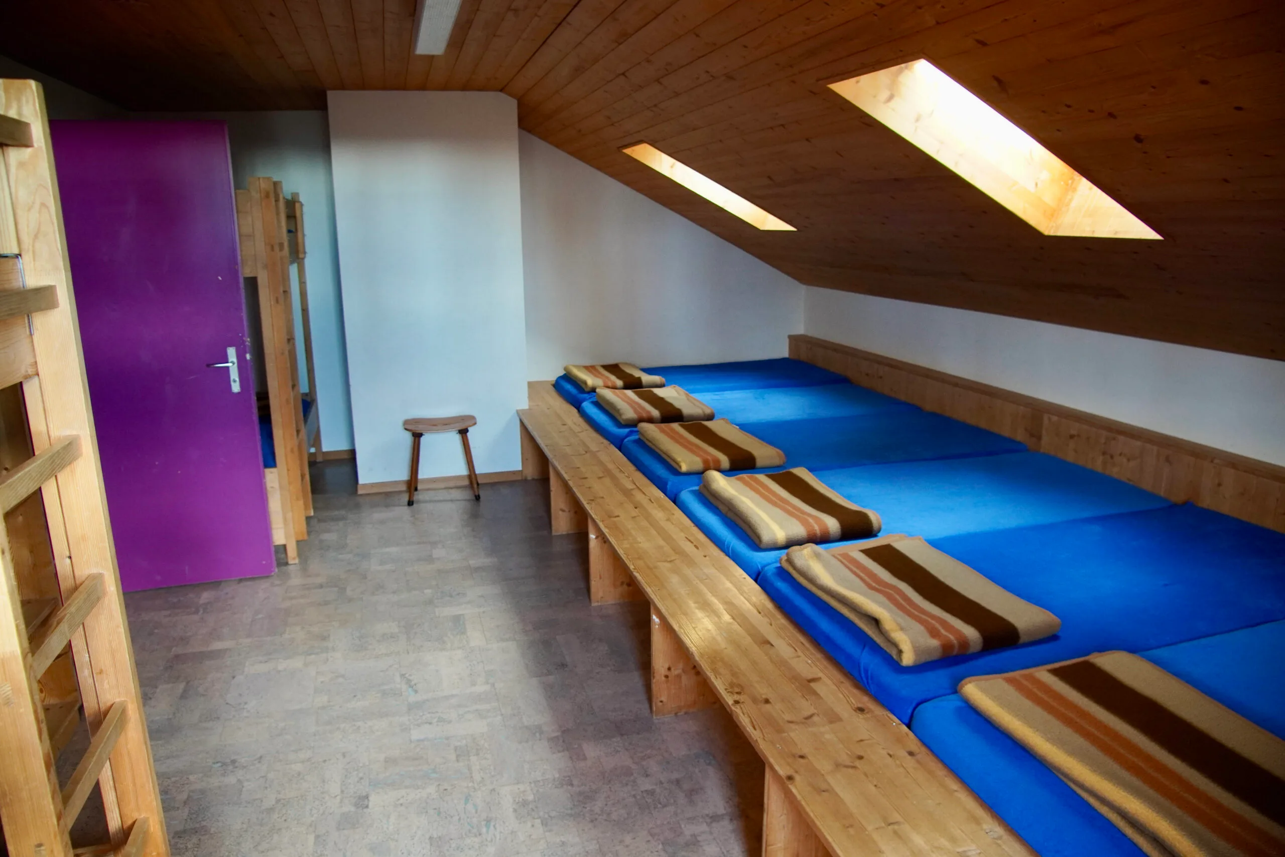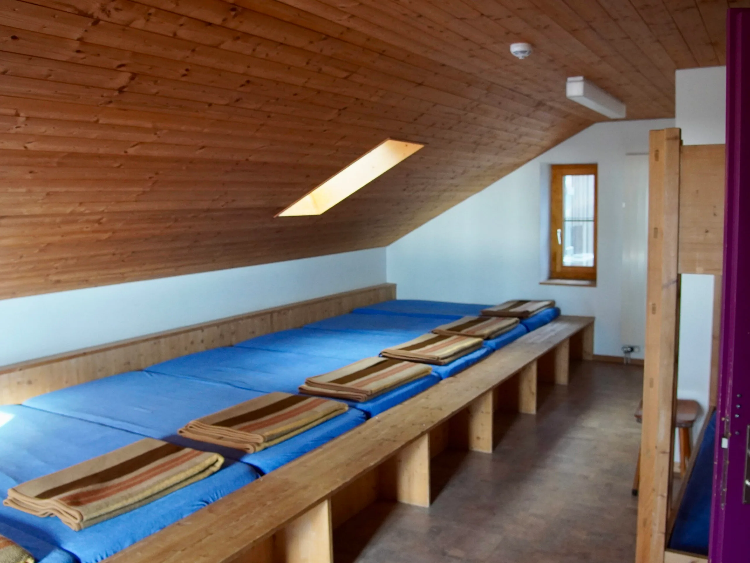 In den beiden Grossraumzimmern mit 11 und 14 Betten ist ein Schlafsack obligatorisch und muss selbst mitgebracht werden. Wolldecken stehen zur Verfügung. Hier schläft man unter dem Dach und ist Himmel, Mond und Sternen etwas näher.